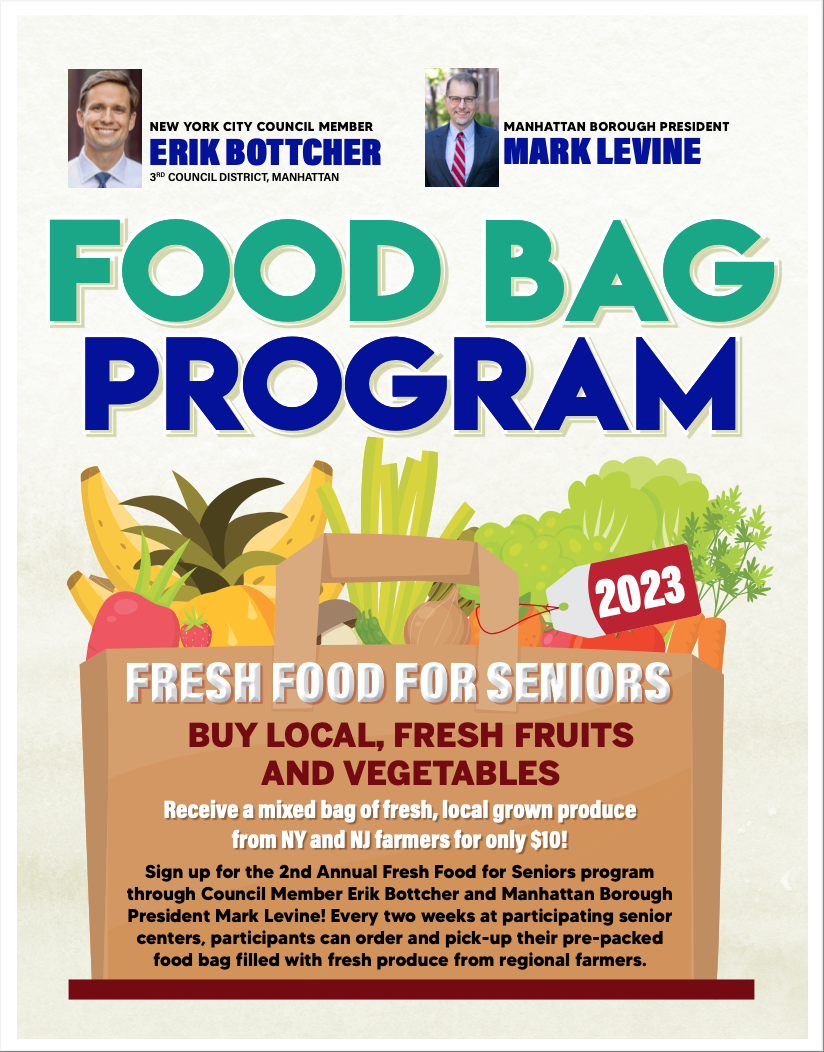 Starting July 17, visit a participating senior centers (see list below) and sign up for the program by paying $10 for a bag. The following week, pick up your pre-packed food bag, filled with the fruits and vegetables that are in season.