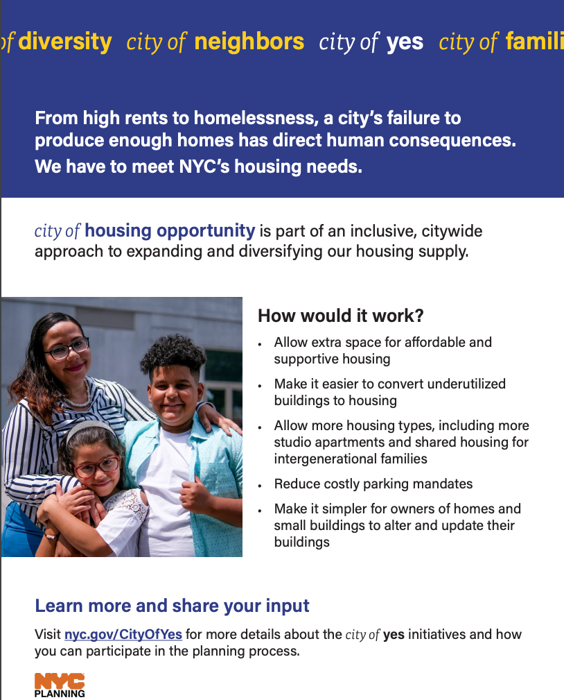 On September 21, NYC City Planning announced Mayor Eric Adams’ City of Yes for Housing Opportunity, a citywide initiative to address the housing shortage by creating a little more housing in every neighborhood.
