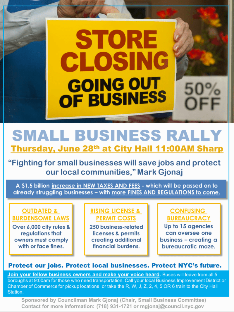 On June 28th, 2018, Bronx Councilmember Mark Gjonaj, alongside small-business owners and various local politicians, organized a rally outside City Hall to advocate for the protection of small businesses across New York City.