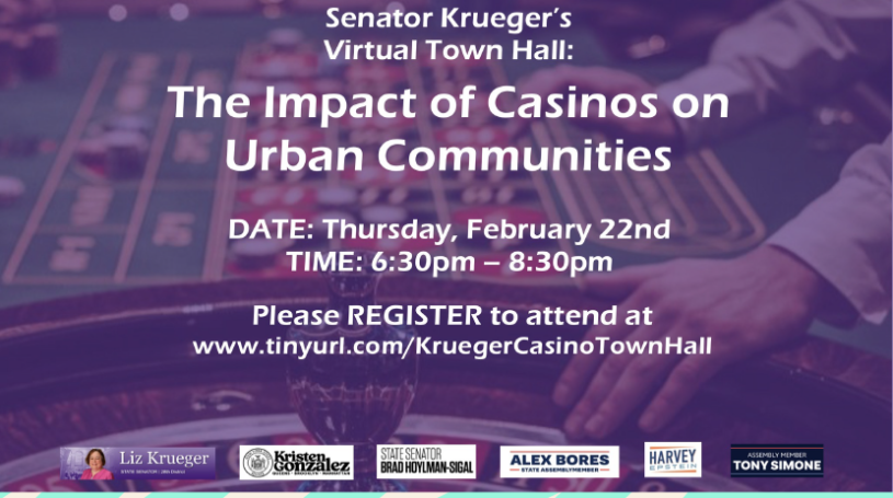 On Thursday, February 22nd from 6:30 p – 8:30 pm, join Senator Krueger for a virtual town hall on the “Impact of Casinos on Urban Communities.” You will hear from the experts about the casino siting process, the fiscal and economic impacts of gaming institutions, and their impact on individuals, businesses, and the surrounding community. The event will be co-sponsored by local elected officials who may be involved in the casino siting process, including Senators Brad Hoylman and Kristin Gonzalez, and Assemblymembers Alex Bores, Tony Simone, and Harvey Epstein.